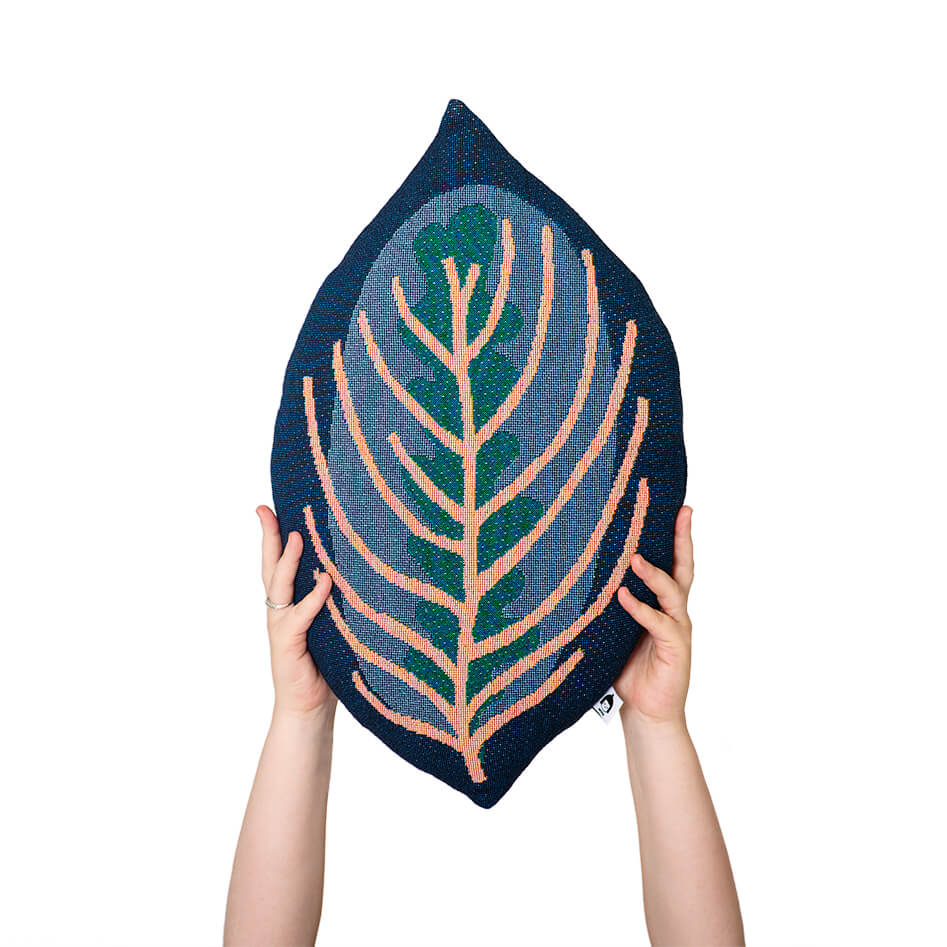 Premium quality happy Jacquard throw cushion shaped as a Calathea leaf. Your unique way to celebrate a couch or a bed. This Cushion is part of the new collection GENESIS - an illustrated interpretation of the genesis 6 days creation story, bringing bits of light and color into the world of textiles.